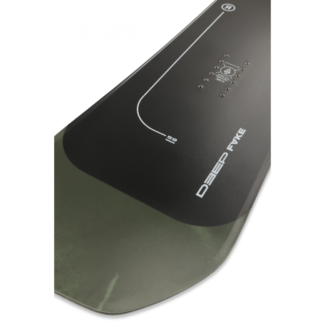 The RIDE Deep Fake lives up to its name. Designed for stability and quick edge-to-edge control in all conditions. With a Directional Extra Camber profile this board is built for stability and pop while giving just enough rise in the nose to float on those deeper days. The Deep Fake is designed to be ridden in a standard length, no downsize needed. The Tapered Linear Quadratic Sidecut is designed for smooth turn initiation and powerful grip through turns without washing out. Deep Fake features Metal Slim Wall construction, a section of titanal metal layered with urethane running the edge of the board, increasing dampening, durability, and responsiveness. This is a premium all-mountain board and features RIDE's Performance™ Core, Carbon Array 5™ , Sintered Stone Ground Race Base, and all new bio-resin. Deep Fake is built for riders that take advantage of all snow conditions while staying under the radar.